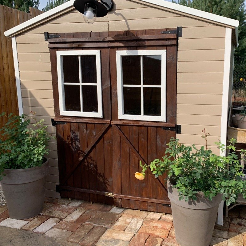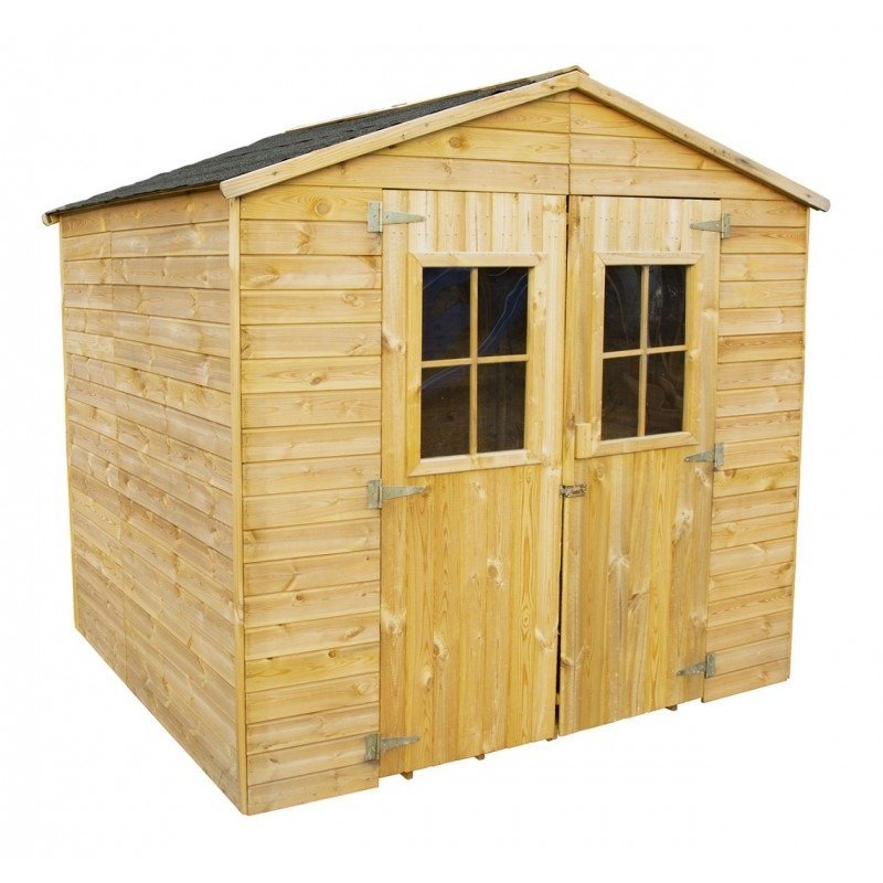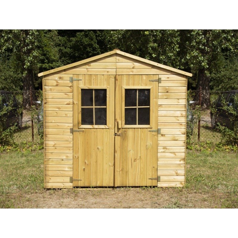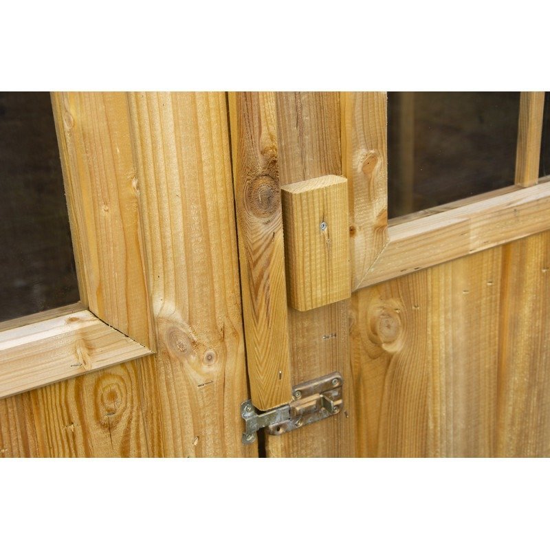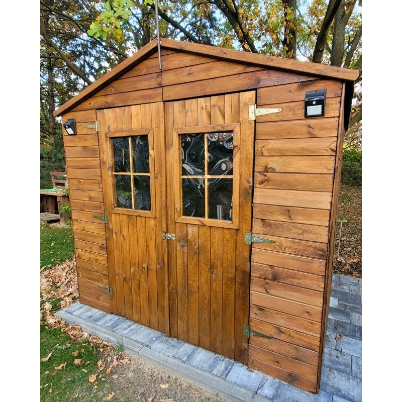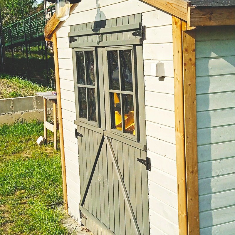 Duża, drewniana narzędziownia została wykonana z impregnowanego drewna iglastego. Impregnacja zapewnia trwałość produktu i odporność na czynniki zewnętrzne. Drzwi wyposażone są w okna. Drewniana narzędziownia wpisuje się w każdy ogród. Konstrukcja jest łatwa w montażu – część jest już złożona, dzięki czemu zaoszczędzisz czas. Do drzwi dołączone są solidne zawiasy, które dodatkowo stabilizują drzwi.