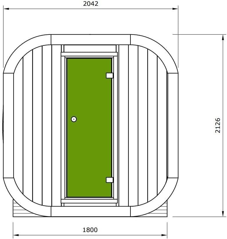- Genoeg ruimte: de buitensauna van 204 x 225 cm biedt met 2 hoogwaardige ligvlakken van thermisch sparrenhout voldoende ruimte voor 4 personen. De totale hoogte van de tuinsauna is 212 cm.