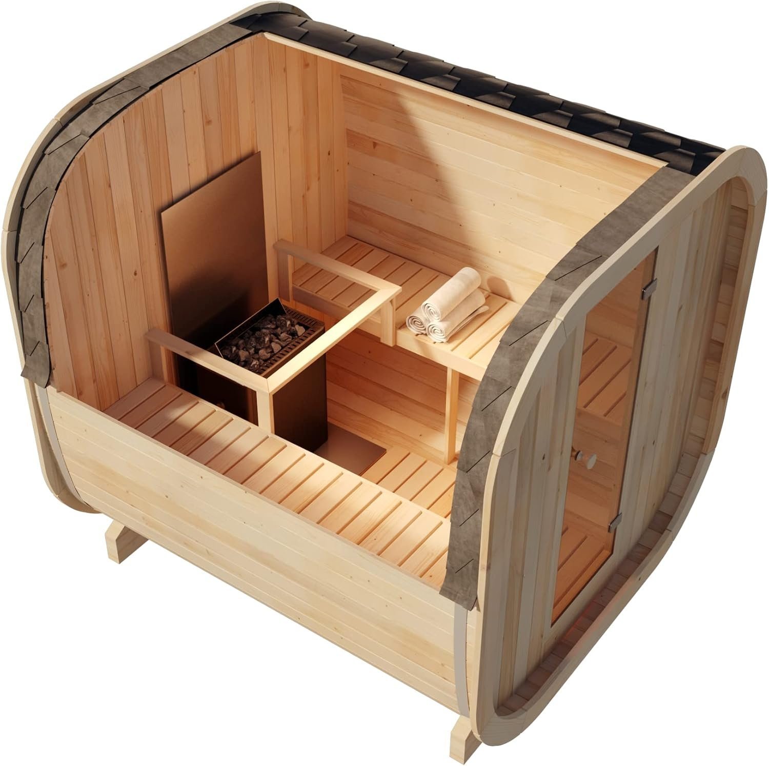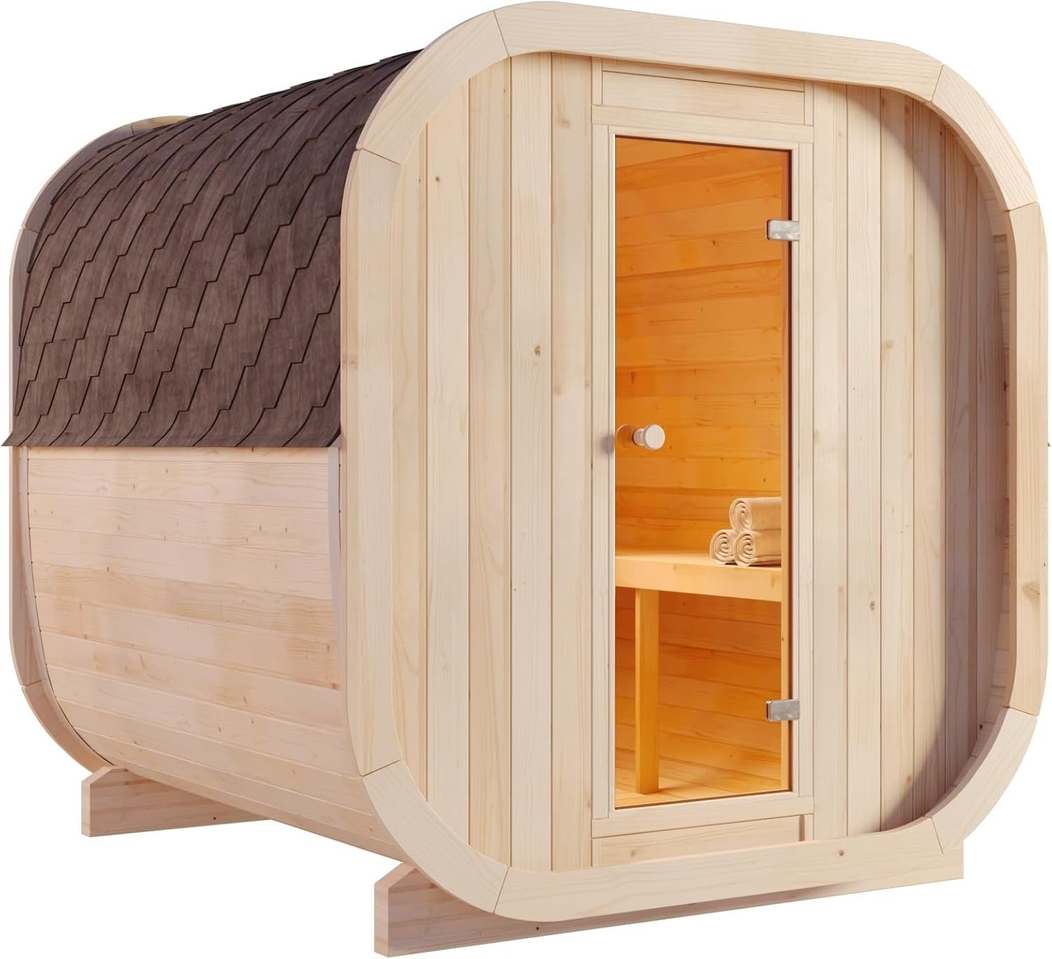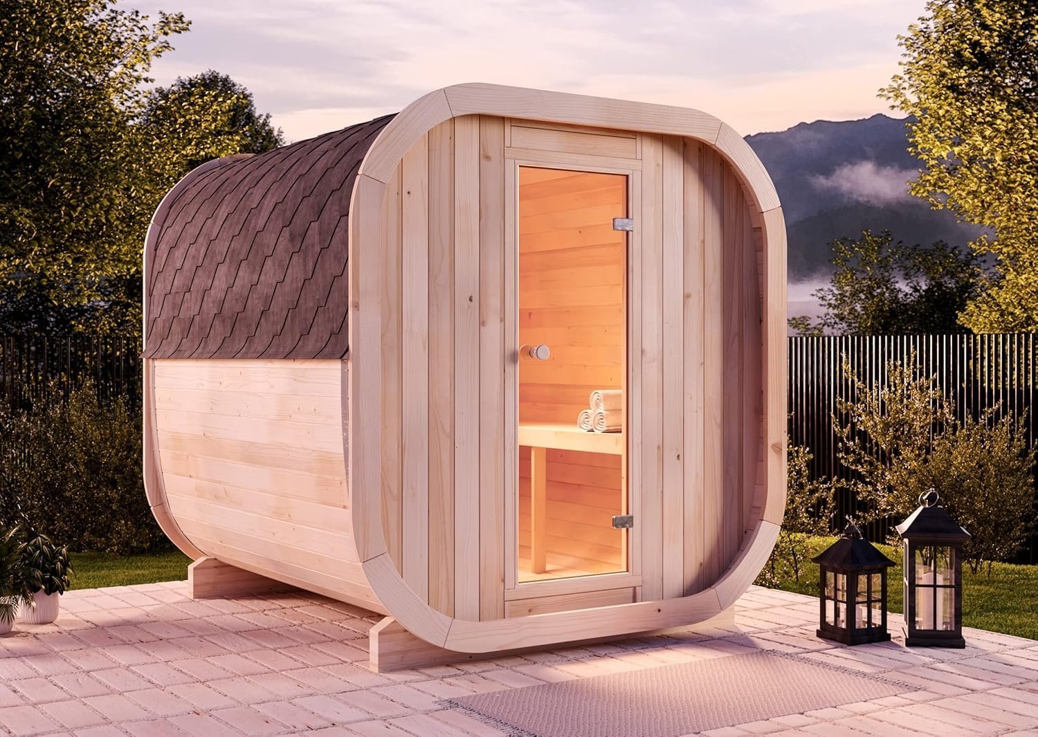 - Modern design: het kubusvormige ontwerp van onze ScandiCube barrelsauna biedt u meer ruimte dan klassieke sauna’s. Kies tussen onbehandeld sparrenhout of speciaal voorbehandeld thermisch hout voor een langere levensduur van uw sauna.