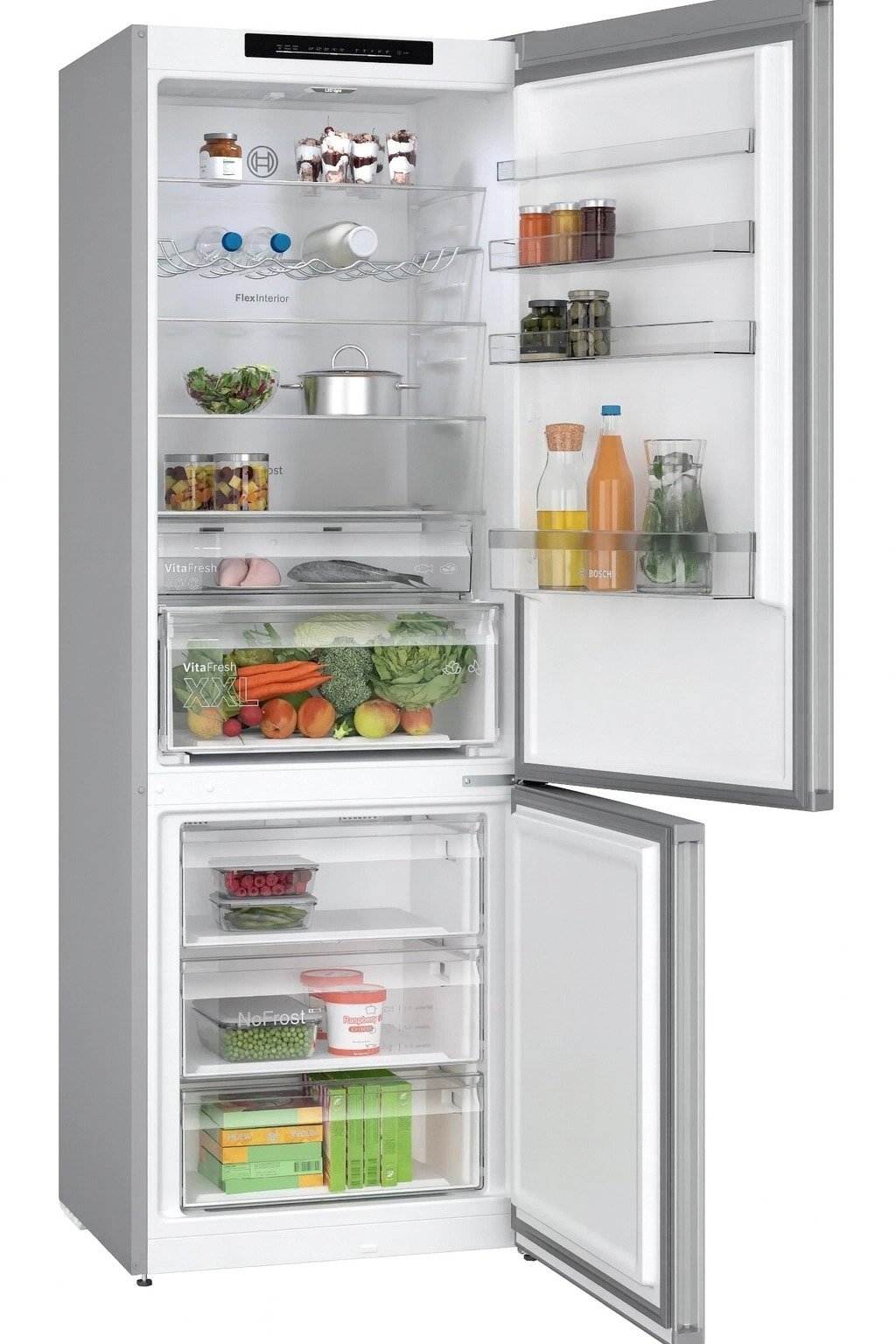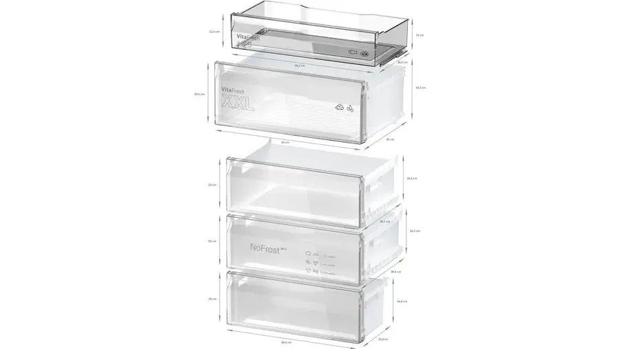 Mała różnica w centymetrach, znaczna różnica w pojemności: dodatkowe 10 cm szerokości w stosunku do standardowego modelu pozwala swobodnie przechowywać blachy do pieczenia, arbuzy i inne spore rzeczy w Twojej chłodziarko-zamrażarce. Posiadamy szeroką ofertę chłodziarko-zamrażarek o różnym designie. W asortymencie znajdują się urządzenia o szerokości 70 cm (Bosch KGN49), które mają o 20%* większą pojemność. * W porównaniu ze standardowym modelem o szerokości 60 cm, np. Bosch KGN39.