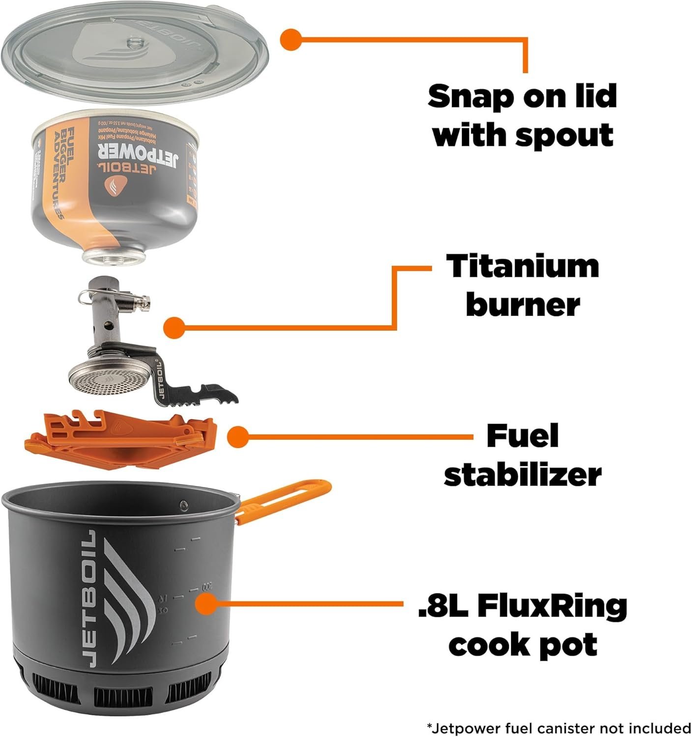 - Comprend : Brûleur en titane, casserole FluxRing de 0,8 L avec couvercle, stabilisateur de carburant, instructions (*carburant Jetpower et briquet non inclus)