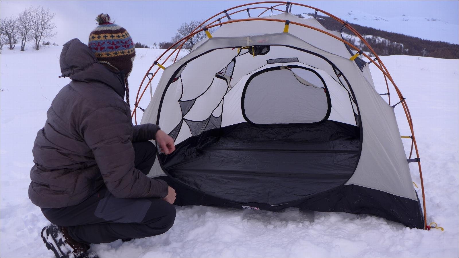 - de l’absence d’entrées d’air au ras du sol et donc une meilleure isolation, appréciable par températures basses (en conditions non hivernales, ça aura au contraire l’inconvénient d’empêcher une saine aération de l’habitacle) et par très mauvais temps (évite de retrouver de la neige partout dans l’abside, voire même dans la tente, après une nuit de tempête).