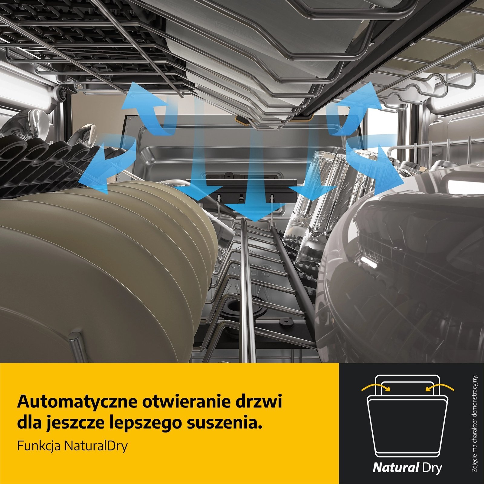 Naturalny sposób na suche i lśniące naczynia z wykorzystaniem powietrza spoza zmywarki – po zakończeniu cyklu zmywarka automatycznie się otwiera umożliwiając suszenie naczyń.